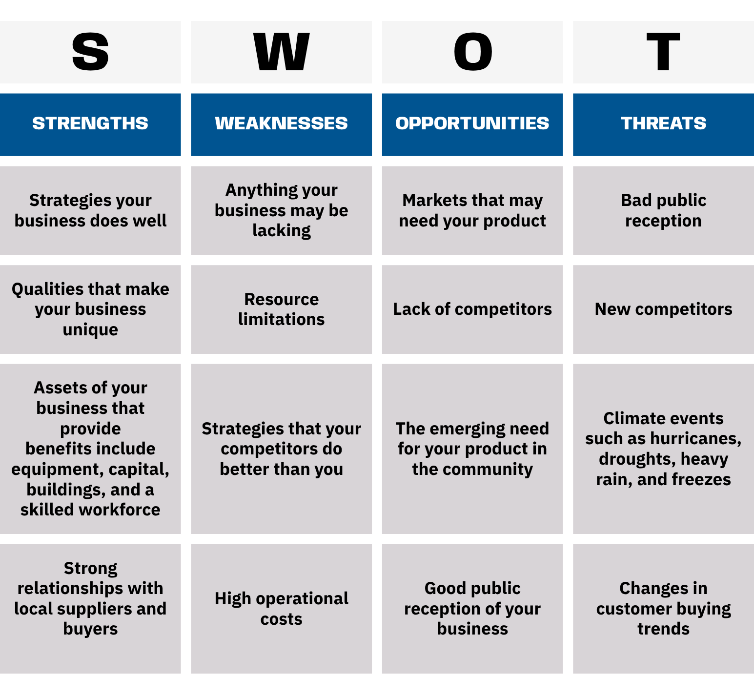 A SWOT analysis is a tool that can help you identify the strengths, weaknesses, opportunities, and threats of your business.