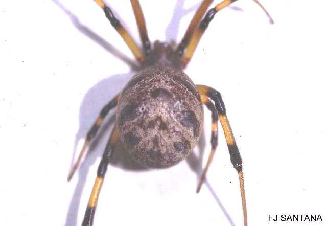 Because they vary from light tan to dark brown or almost black, with variable markings of black, white, yellow, orange, or brown on the back of their abdomens, brown widows are not as easy to recognize as black widows. The underside of the abdomen, if you can see it, contains the characteristic hourglass marking. Unlike the black widow, though, the hourglass is orange to yellow orange in color. The following photographs show the hourglass marking under the abdomen and the variety of color phases this spider exhibits.
